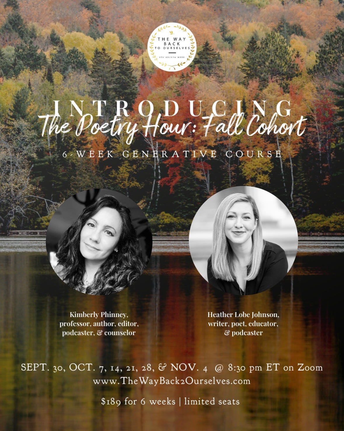 Don’t miss out on enrolling in the Fall Poetry Cohort with Kimberly Phinney and Heather Lobe Johnson. Classes start 9/30 and there are just a few seats left! If you love poetry, want to grow in your craft and knowledge, are interested in writing a collection, and are looking for a supportive community, then the Poetry Cohort is for YOU! You can learn more about it and purchase your seat HERE.